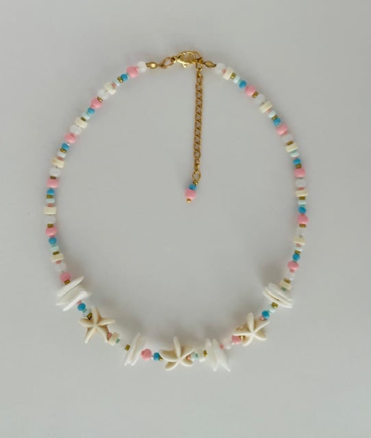 The Beach Kissed choker necklace captures the carefree spirit of sun, sand, and sea. Designed with a vibrant mix of blue, pink, white, and matte gold glass beads, it’s accented with natural shell chip beads and charming white, turquoise starfish beads for a true coastal feel.