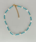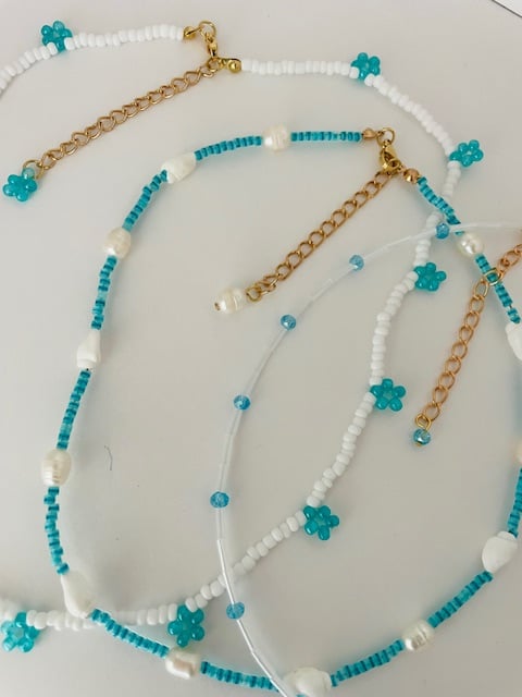 The Crushing Waves 3-piece necklace captures the beauty and movement of the ocean in a layered coastal design. Featuring a harmonious blend of teal and white glass beads, natural seashell beads, and lustrous freshwater pearls, each strand reflects the serene colors and textures of the sea.