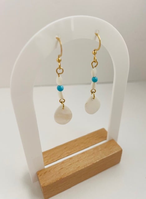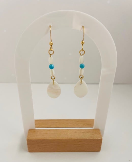 These earrings are made of stainless-steel gold findings, shell pendant and beads, and turquoise beads. Earrings are made to order, so please allow 3-4 days for processing.