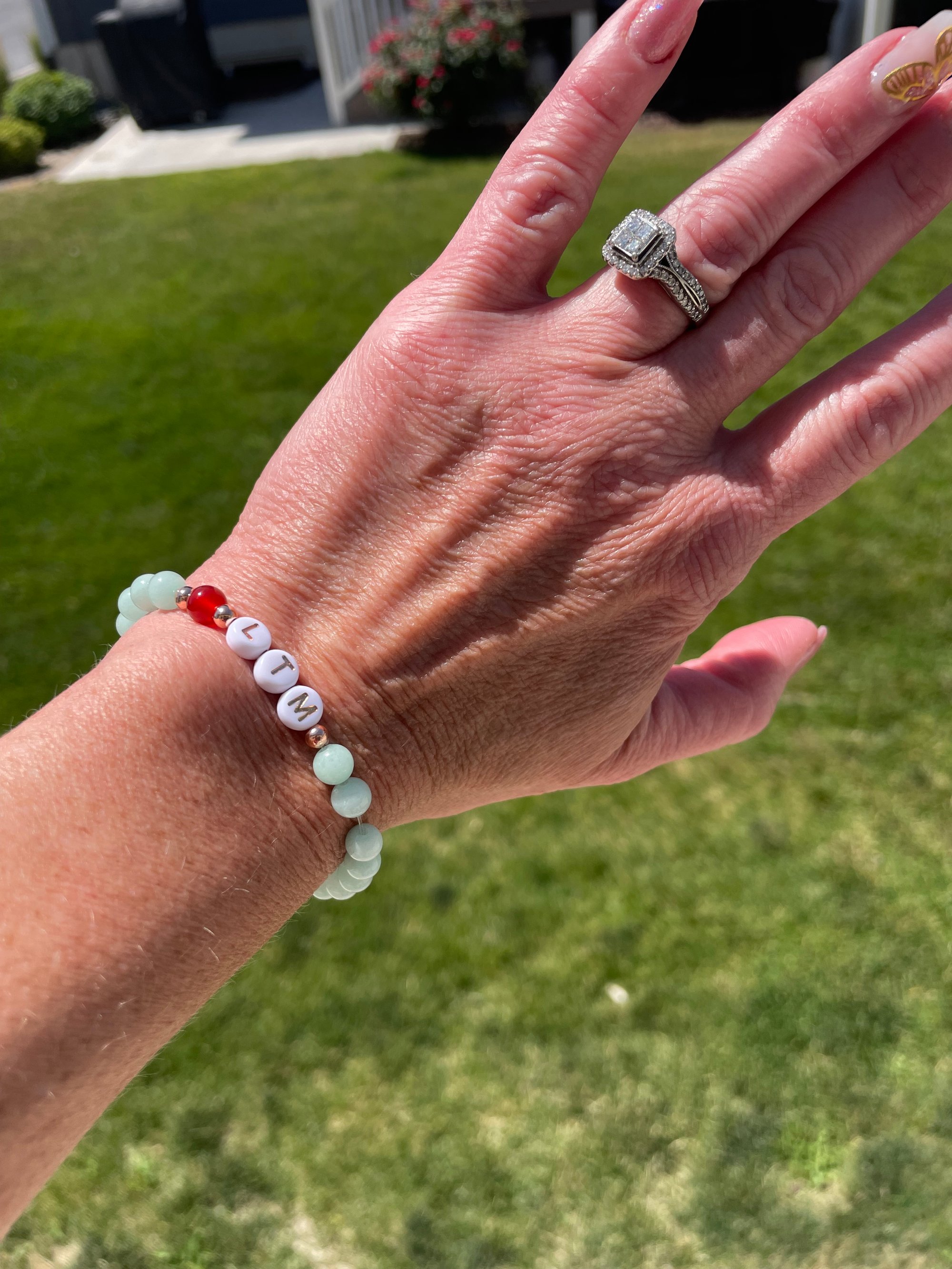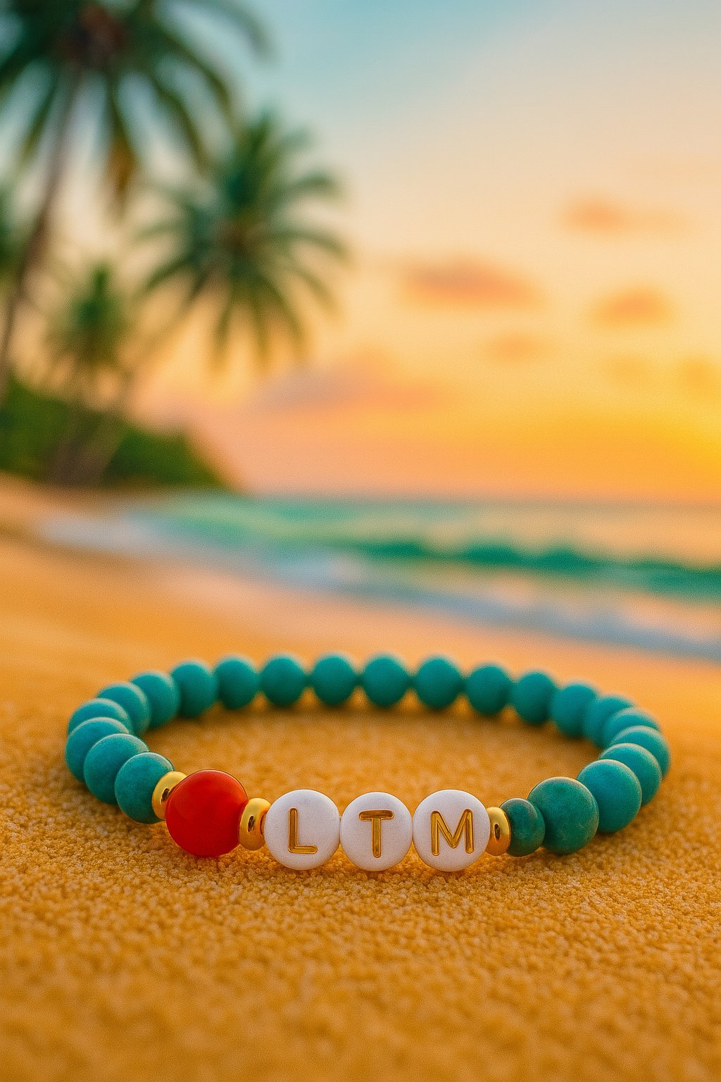 This handmade Amazonite-inspired LTM bracelet is a quiet rebellion. It features smooth Amazonite beads and a bold red Agate accent bead. The rose gold lettered LTM beads remind you to unplug and reset. It symbolizes awakening, truth, and emotional strength. Wear it daily for conscious reminder.