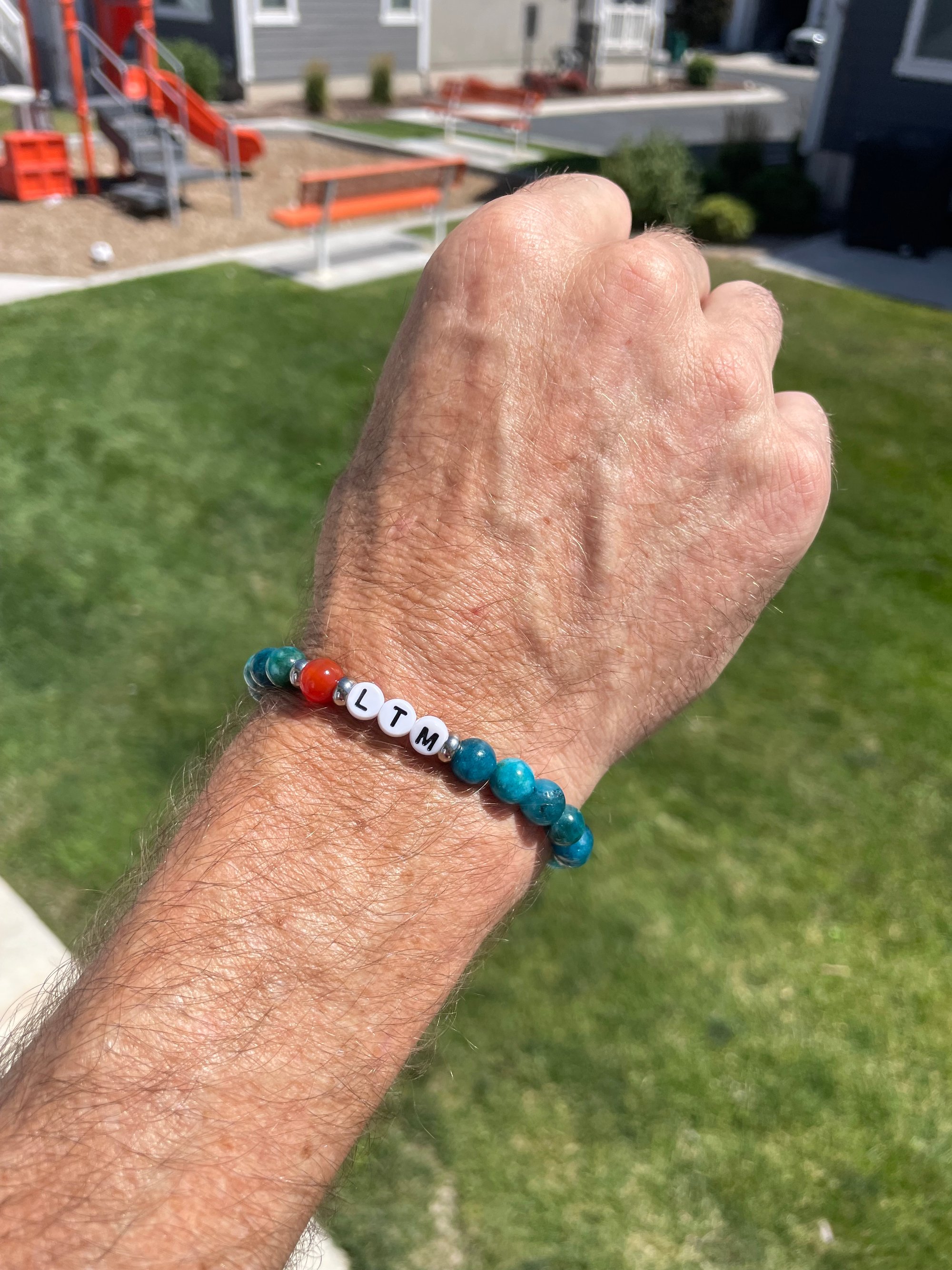 Discover the LTM Men's Blue Apatite Bracelet, crafted for clarity and personal power. This bracelet connects you to your inner strength, paired with the LTM message. It's accentuated by a bold red agate bead, symbolizing true courage, and choice. Wear it daily as a reminder that you have decided to "Leave the Matrix."