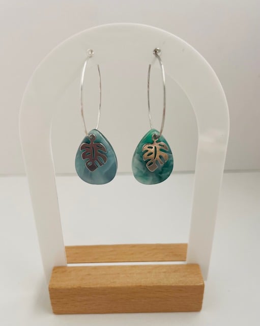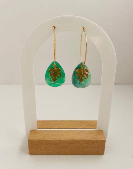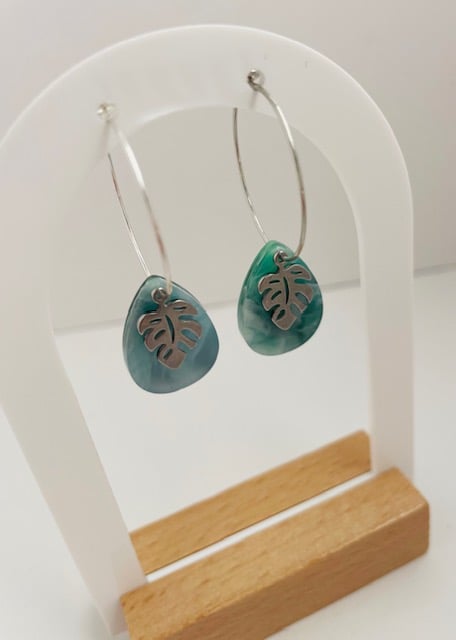 These hoop earrings are made from stainless-steel hoops, monstera charms and acrylic pendants. They come in silver and gold. These earrings are made to order. Please allow 3-4 days for processing.