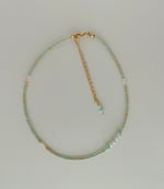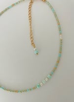 The Palm Tree & Pearls choker necklace captures the essence of tropical elegance with a serene blend of ocean-inspired hues and natural textures. Featuring soothing amazonite beads, lustrous freshwater pearls, and shimmering gold and aqua glass beads, this piece evokes the tranquil beauty of palm-lined shores.