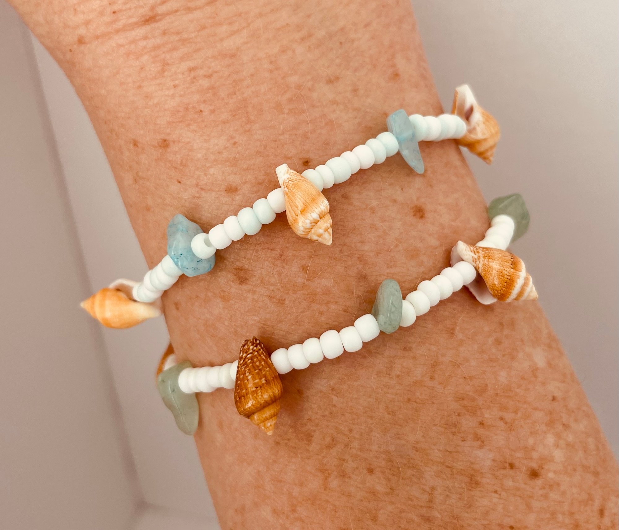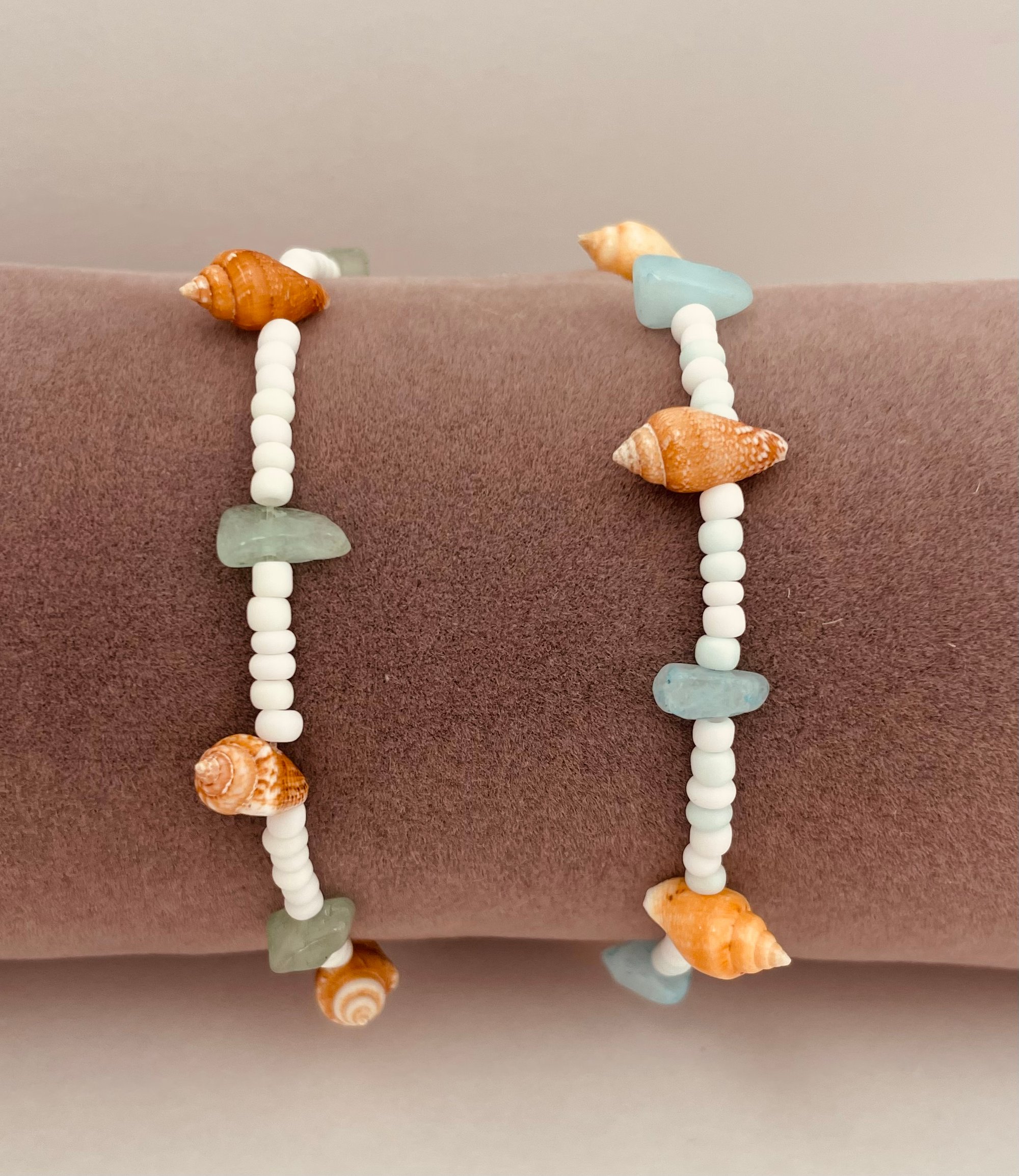 These bracelets are made out of glass beads, Blue Aquamarine stone chips or Green Aventurine stone chips, seashells and elastic cord. These bracelets are 6.25". If you need a different size, please note at checkout or email [email protected]. Each bracelet is made to order. Please expect a 3–4-day processing time.
