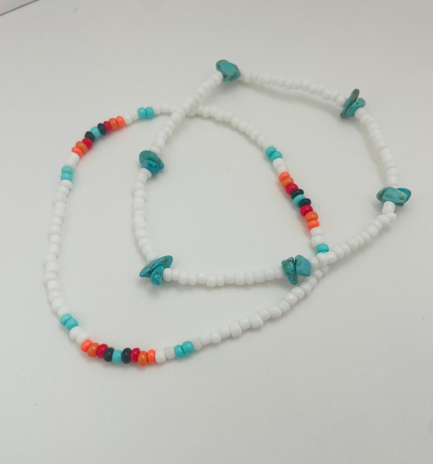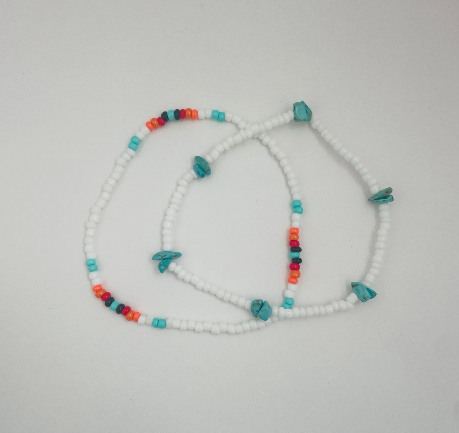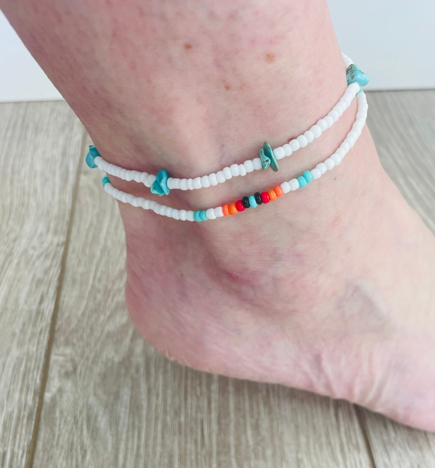 Both bracelets are made with strong elastic cord, glass beads and turquoise bead chips. Anklets measure 8.75". If you need a different size, please specify at checkout or email [email protected]. Anklets are made to order, so please allow 3-4 days for processing.