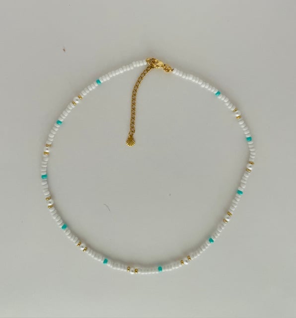 The Tidal Treasure choker necklace captures the beauty of the sea with its luminous blend of coastal tones and natural elements. Designed with white and teal glass beads, lustrous freshwater pearls, and stainless-steel gold spacer beads, this piece reflects the shimmer of sunlight dancing on ocean waves.
